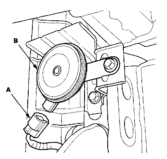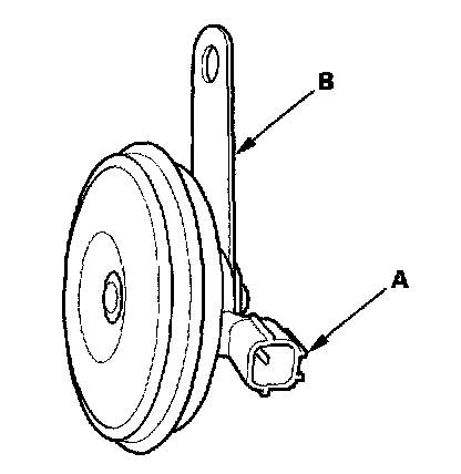 3. Test the horn by connecting battery power to the terminal (A) and grounding the bracket (B). The horn should sound.