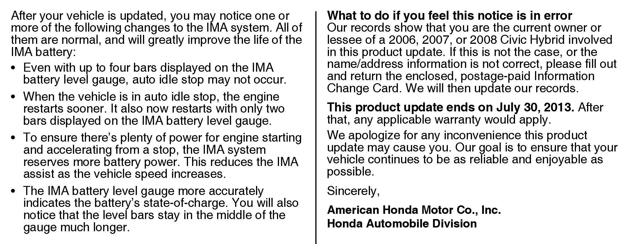 Campaign - IMA Battery Deterioration Software Updates