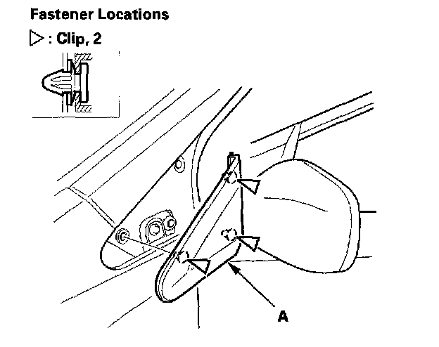 3. Pull the A-pillar corner trim (A) back by hand to detach remaining lower clips, then remove the trim.