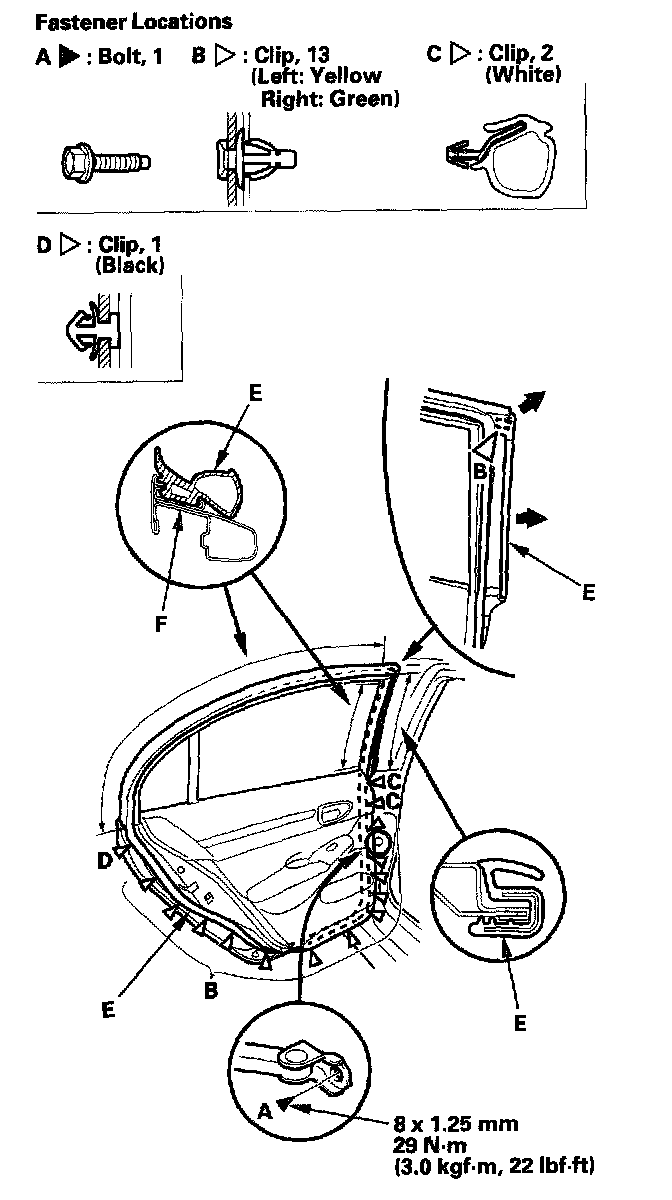 2. Detach the clips (B, C, D), then remove the door weatherstrip (E).