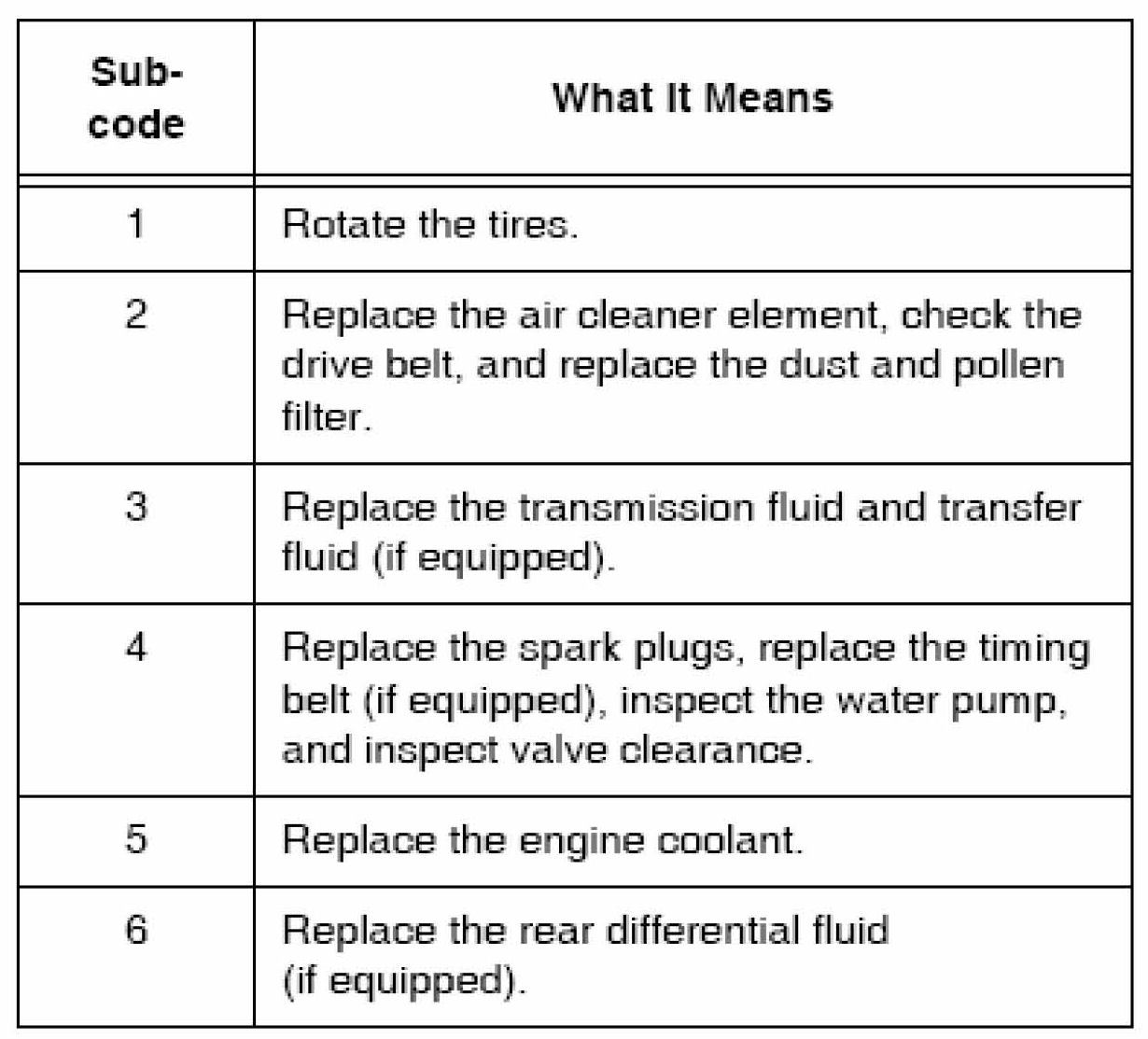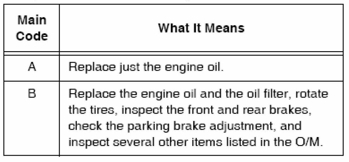 This code tells you what items need servicing when you have the engine oil replaced. The first part of the code is the main code. It's either A or B, never both. Here's what they mean: