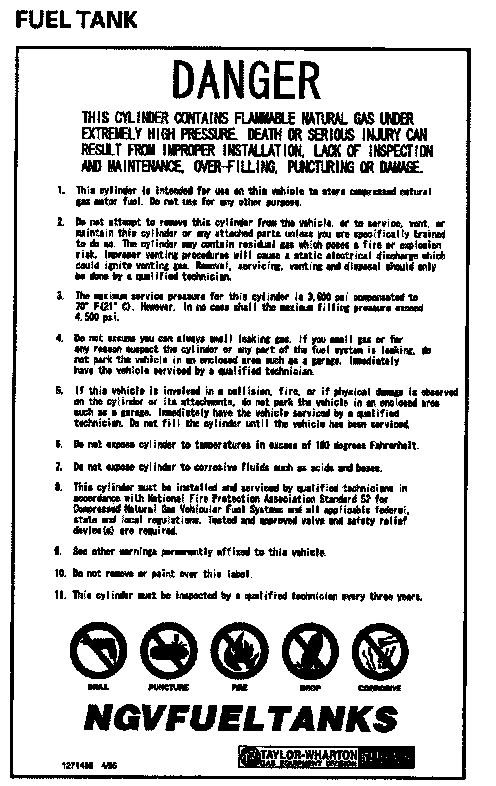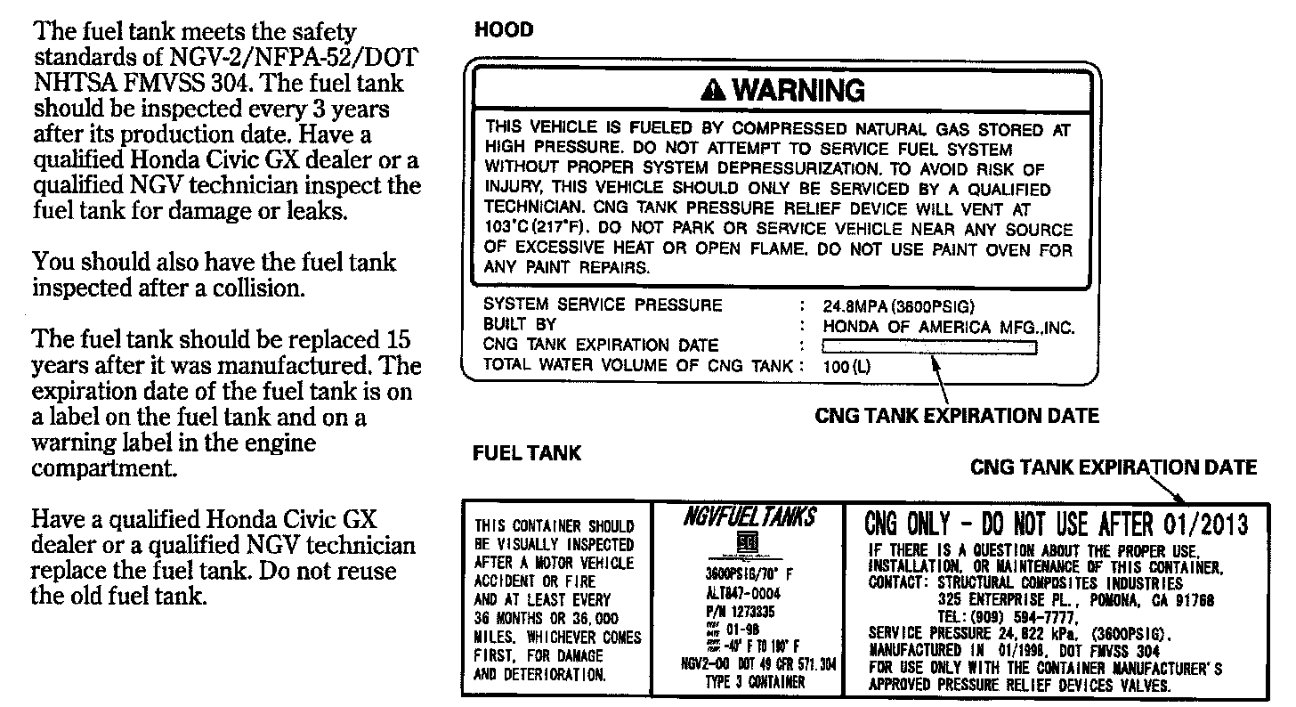 WARNING: Compressed natural gas is flammable and highly explosive. You could be killed or seriously injured if leaking natural gas is ignited. Stop the engine, and keep heat, sparks and flame away.