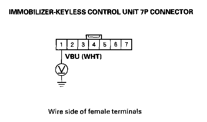9. Check for voltage between the immobilizer-keyless control unit 7P connector No. 1 terminal and body ground.
