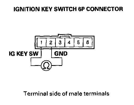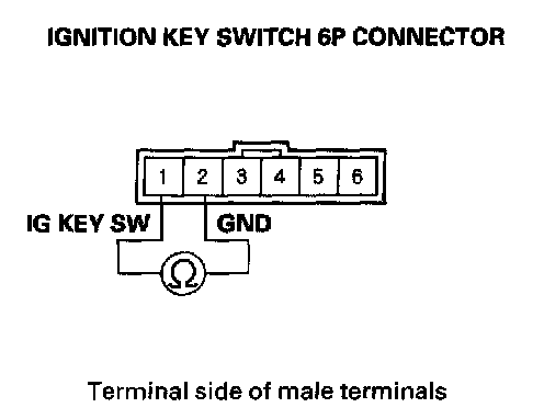 11. At the ignition key switch side, check for continuity between the ignition key switch 6P connector No. 1 and No. 2 terminals.