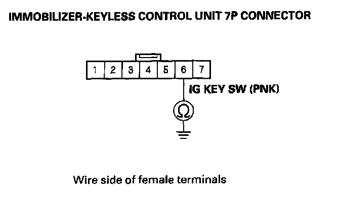 14. Check for continuity between the immobilizer-keyless control unit 7P connector No. 6 terminal and the ignition key switch 6P connector No. 1 terminal.