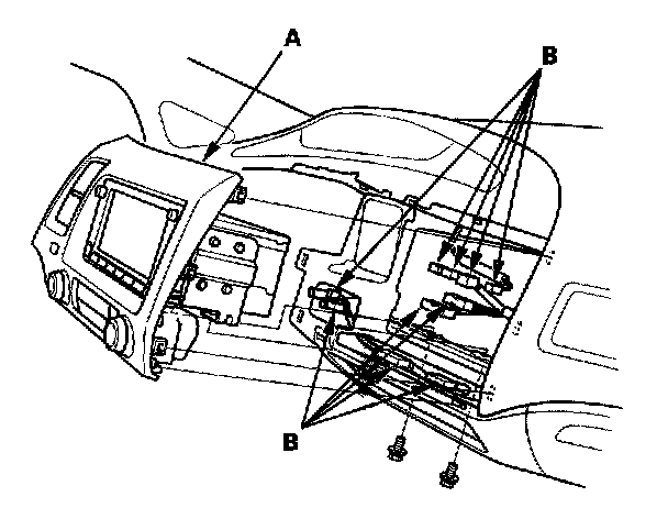 4. Disconnect the connectors (B), then remove the center panel.