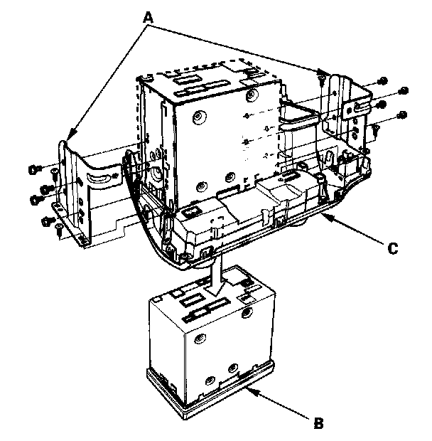 5. Remove the screws, brackets (A), and the navigation unit (B) from the center panel (C).
