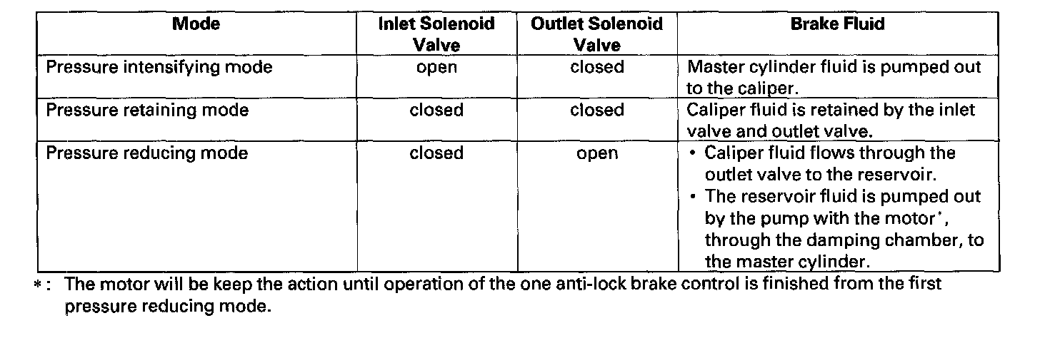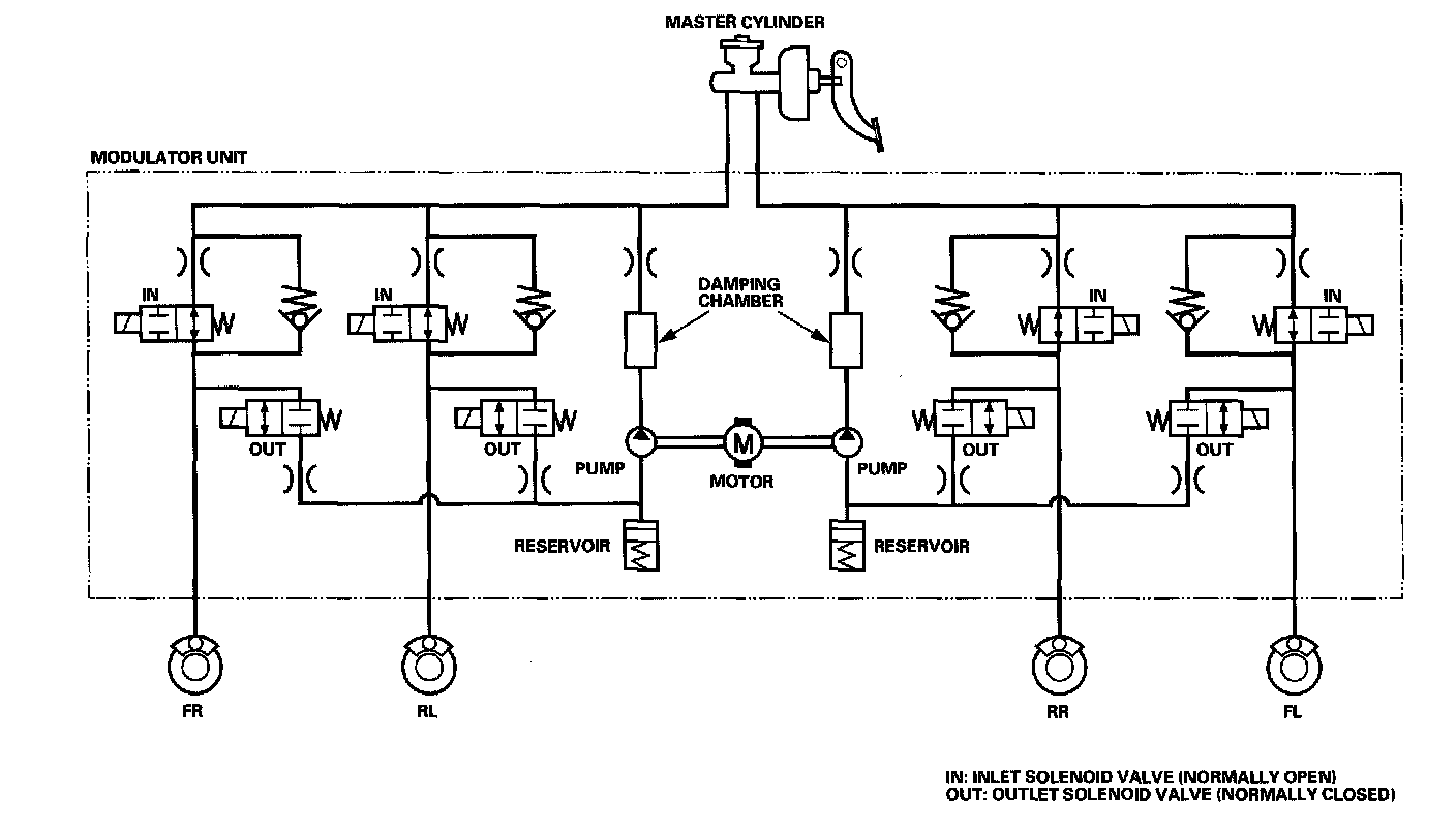 The ABS modulator consists of the inlet solenoid valve, outlet solenoid valve, reservoir, pump, pump motor and the damping chamber. The modulator reduces the caliper fluid pressure directly. It is a circulating-type modulator because the brake fluid circulates through the caliper, reservoir, and the master cylinder. The hydraulic control has three modes; pressure intensifying, pressure retaining, and pressure reducing. The hydraulic circuit is an independent four channel type, one channel for each wheel.