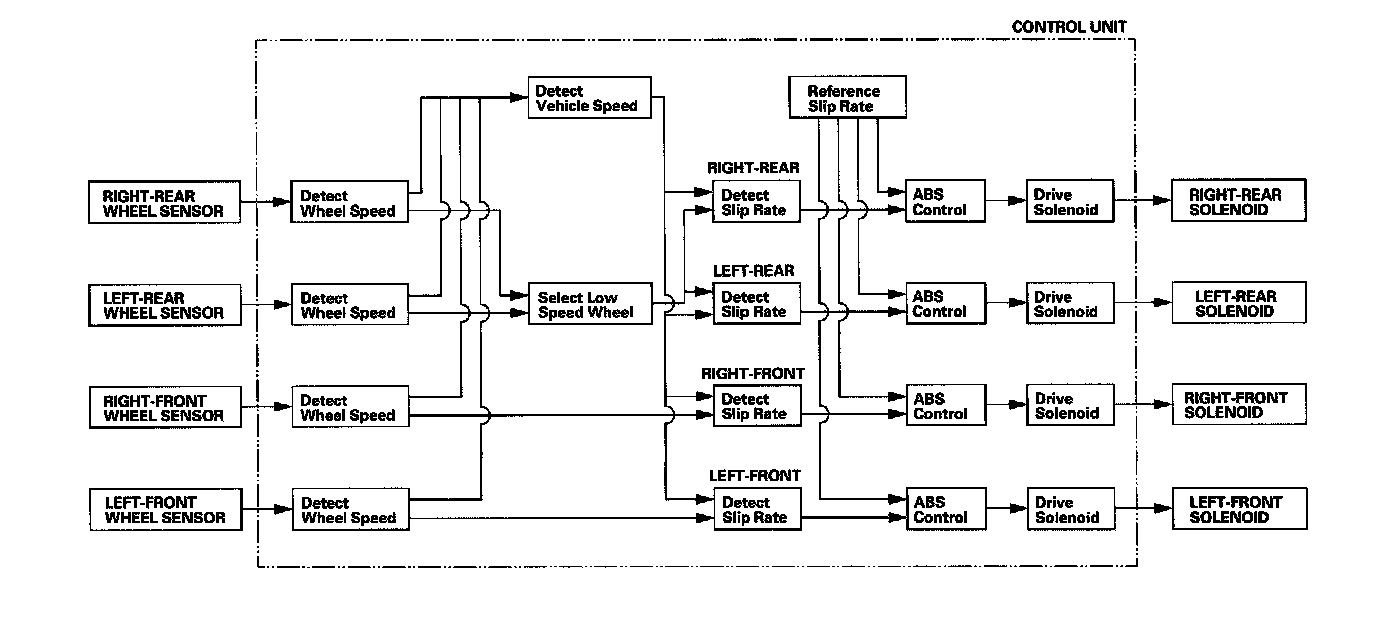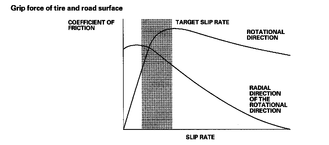 Without ABS, when the brake pedal is pressed while driving, the wheels sometimes lock before the vehicle comes to a stop. In such an event, the maneuverability of the vehicle is reduced if the front wheels are locked, and the stability of the vehicle is reduced if the rear wheels are locked, creating an extremely unstable condition. With ABS, the system precisely controls the slip rate of the wheels to ensure maximum grip force from the tires, and it thereby ensures maneuverability and stability of the vehicle. The ABS calculates the slip rate of the wheels based on the four wheel speed, then it controls the brake fluid pressure to reach the target slip rate.