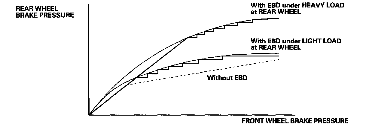 The electronic brake distribution (EBD) helps control vehicle braking by adjusting the rear brake force in accordance with rear wheel load before the ABS operates. Based on wheel sensor signals, the control unit uses the modulator to control the rear brakes individually. When the rear wheel speed is less than the front wheel speed, the ABS modulator-control unit retains the current rear brake fluid pressure by closing the inlet valve in the modulator. As the rear wheel speed increases and approaches the front wheel speed, the ABS modulator-control unit increases the rear brake fluid pressure by momentarily opening the inlet valve. This whole process is repeated very rapidly. While this is happening, there is kickback at the brake pedal.