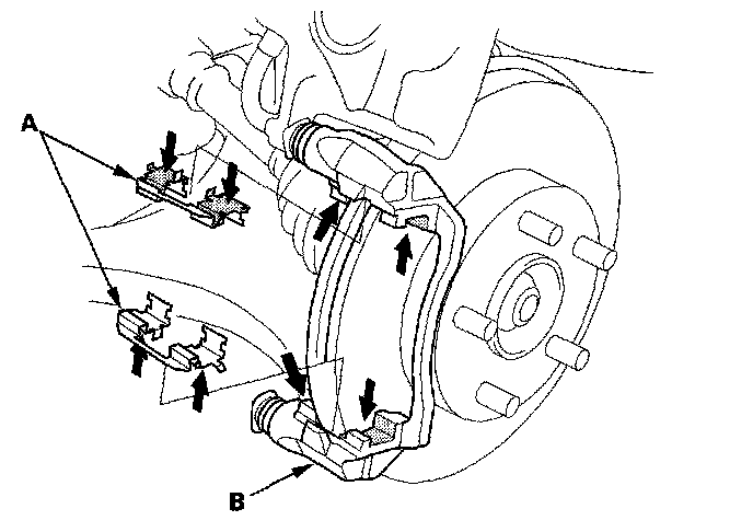 10. Apply a thin coat of M-77 assembly paste (P/N 08798-9010) to the pad side of the shims (A), the back of the brake pads (B) and the other areas indicated by the arrows. Wipe excess assembly paste off the pad shims and brake pads. Contaminated brake discs or brake pads reduce stopping ability. Keep grease and assembly paste off the brake discs and brake pads.
