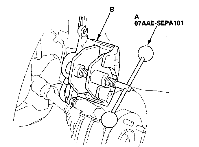 3. Remove the flange bolt (A), and pivot the caliper (B) up out of the way. Check the hose and pin boots for damage and deterioration.