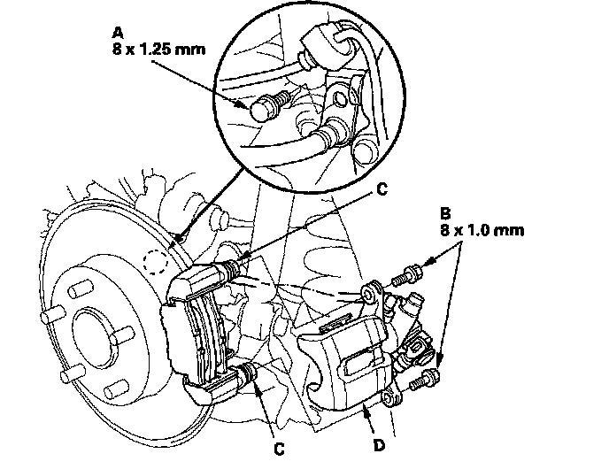 4. Remove the flange bolts (B) while holding respective caliper pin (C) with a wrench. Be careful not to damage the pin boot, and remove the caliper (D). Check the hose and pin boats for damage and deterioration.