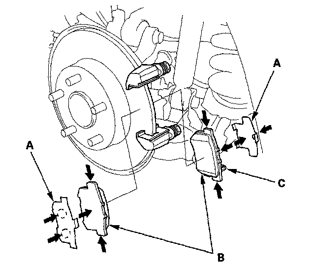 12. Install the brake pads and pad shims correctly. Install the brake pad with the wear indicator (C) on the bottom inside. If you are reusing the brake pads, always reinstall the brake pads in their original positions to prevent a momentary loss of braking efficiency.