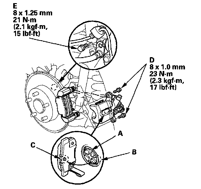 15. Install the brake hose mounting bolt (E).
