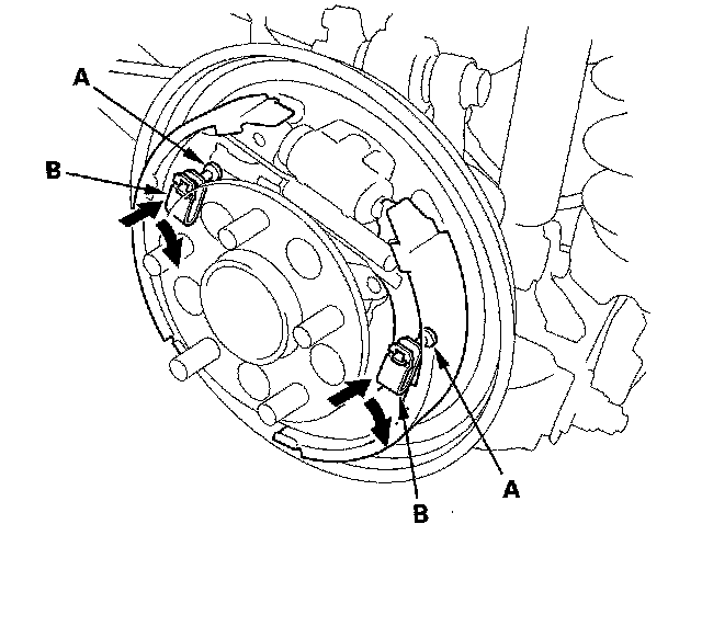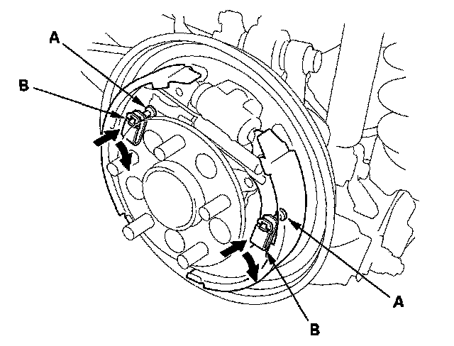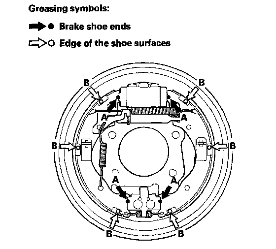 5. Apply a thin coat of Molykote 44 MA grease to the shoe ends (A) and the edge of the shoe surfaces (B) that contact the backing plate as shown. Wipe off any excess. Keep grease off the brake linings.