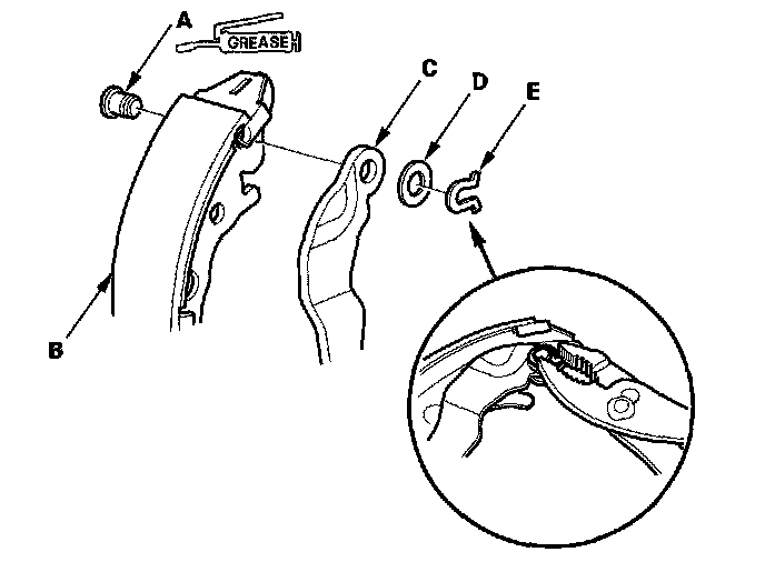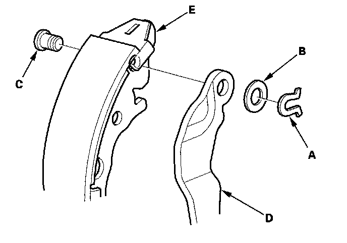 8. Remove the U-clip (A), wave washer (B), and pivot pin (C), and separate the parking brake lever (D) from the brake shoe (E).