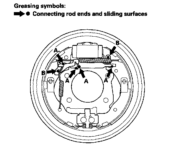 4. Apply a thin coat of rubber grease to the connecting rod ends (A), and the sliding surfaces (B) as shown. Wipe off any excess. Keep grease off the brake linings.
