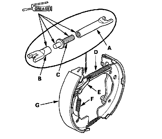 7. Assemble the brake shoes, the upper return spring (D), and with the connecting rods the adjuster bolt on the backing plate, then install the self-adjuster lever (E) and the self-adjuster spring (F) on the forward brake shoe (G).