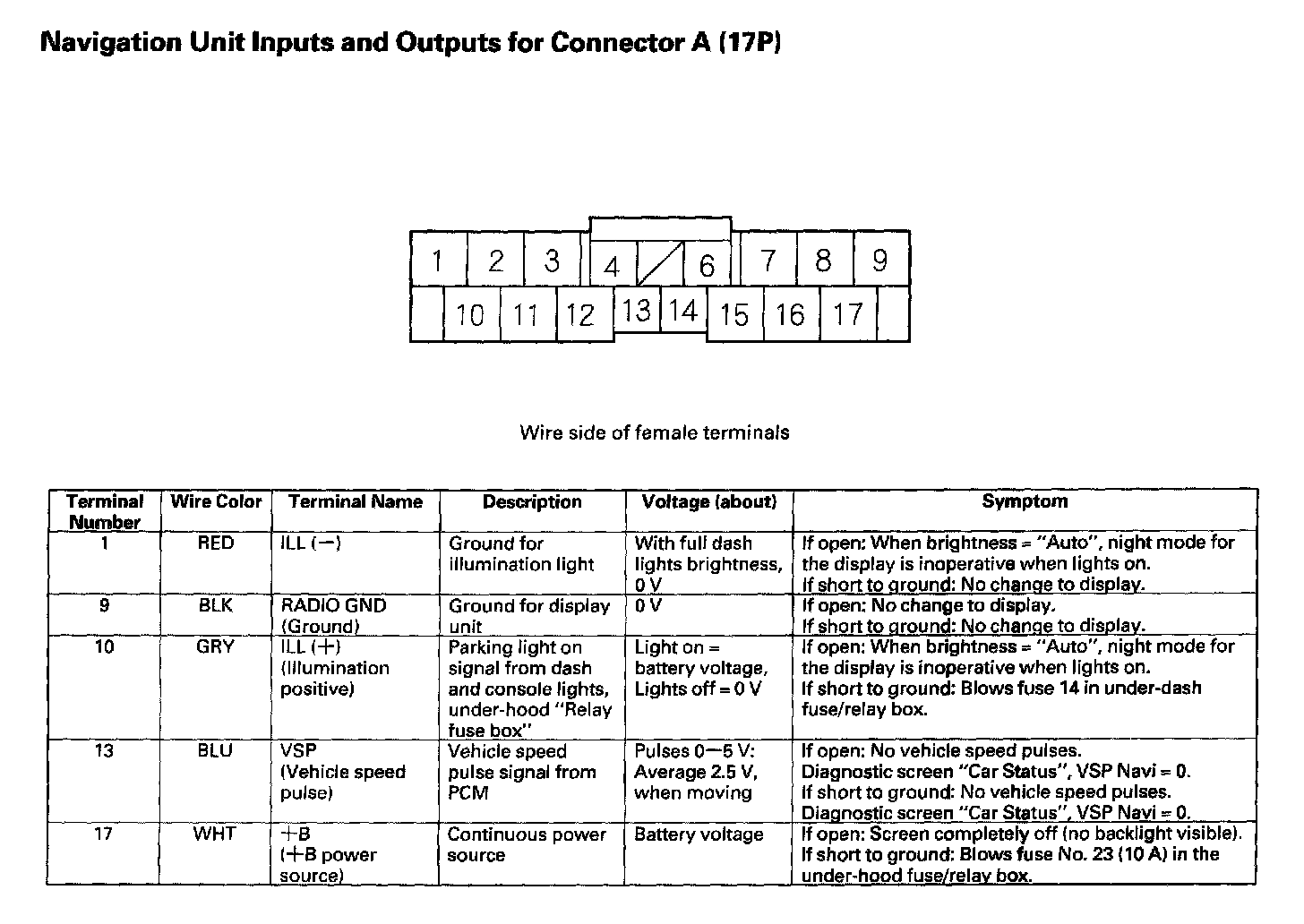 Navigation Unit Inputs And Outputs For Connector A (17P):