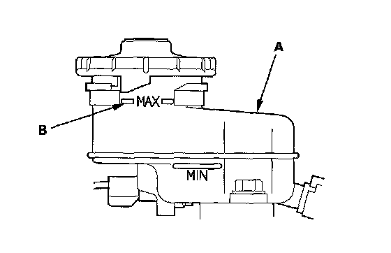 1. Make sure the brake fluid level in the reservoir (A) is at the MAX (upper) level line (B).