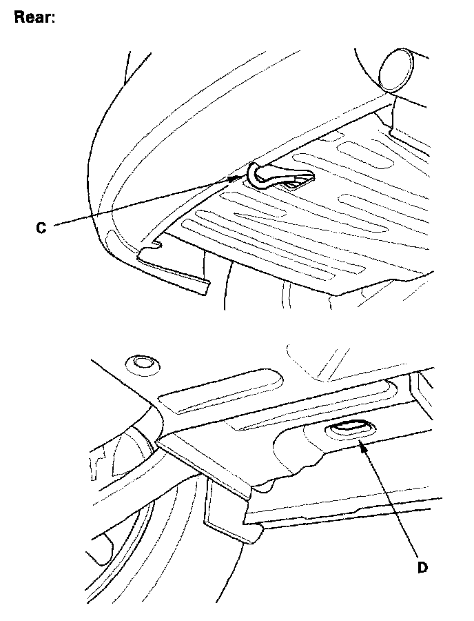 To accommodate flat-bed equipment, the vehicle is equipped with front towing hooks (A), front tie down hook slots (B), rear towing hook (C), and rear tie down hook slots (D).