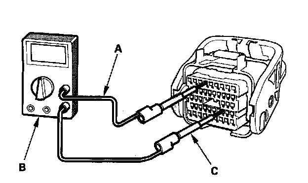 6. Connect one side of the patch cord (A) terminals to a commercially available digital multimeter (B), and connect the other side of the patch cord terminals to a commercially available banana jack (Pomona Electronics Tool No. 3563 or equivalent) (C).
