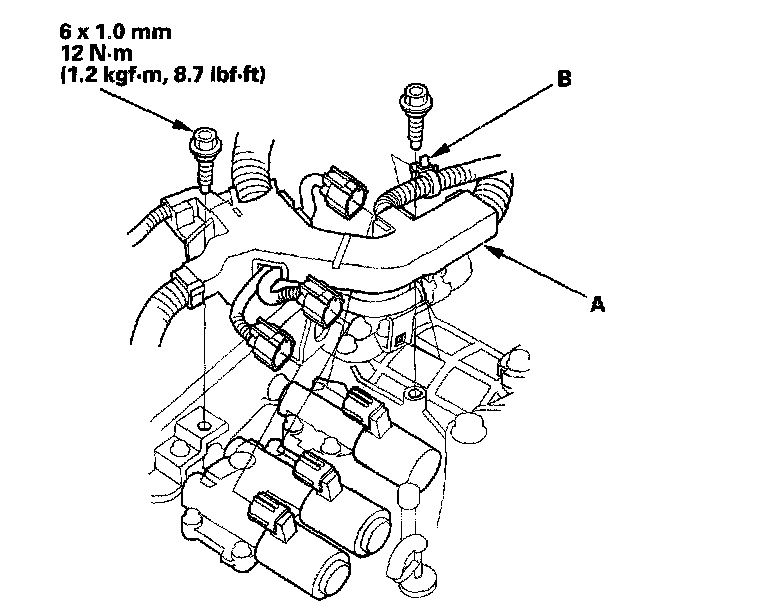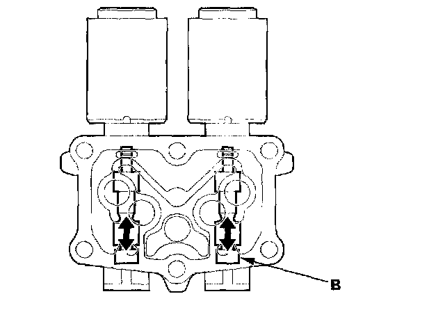 13. Disconnect one of the jumper wires and check valve movement at the fluid passage in the valve body mounting surface. If the valve binds or moves sluggishly, or if the solenoid valve does not operate, replace the A/T clutch pressure control solenoid valve B and C.