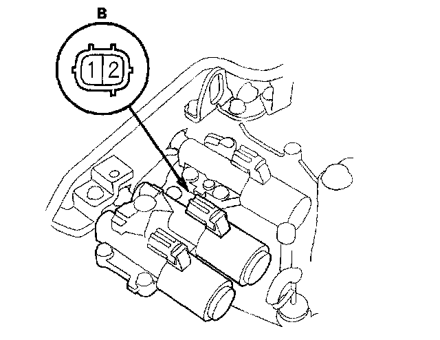 8. Connect a jumper wire from the negative battery terminal to the solenoid valve B connector terminal No. 2, and connect another jumper wire from the positive battery terminal to the connector terminal No. 1.