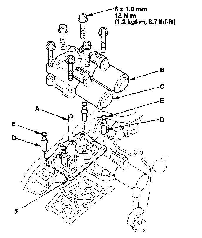 10. Remove the ATF pipe (A), ATF joint pipes (D), O-rings (E), and gasket (F).