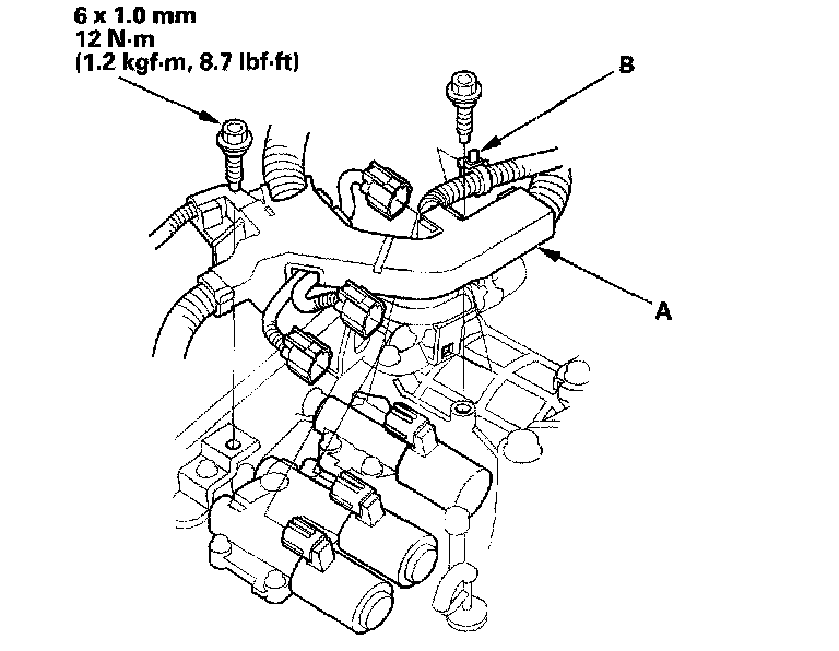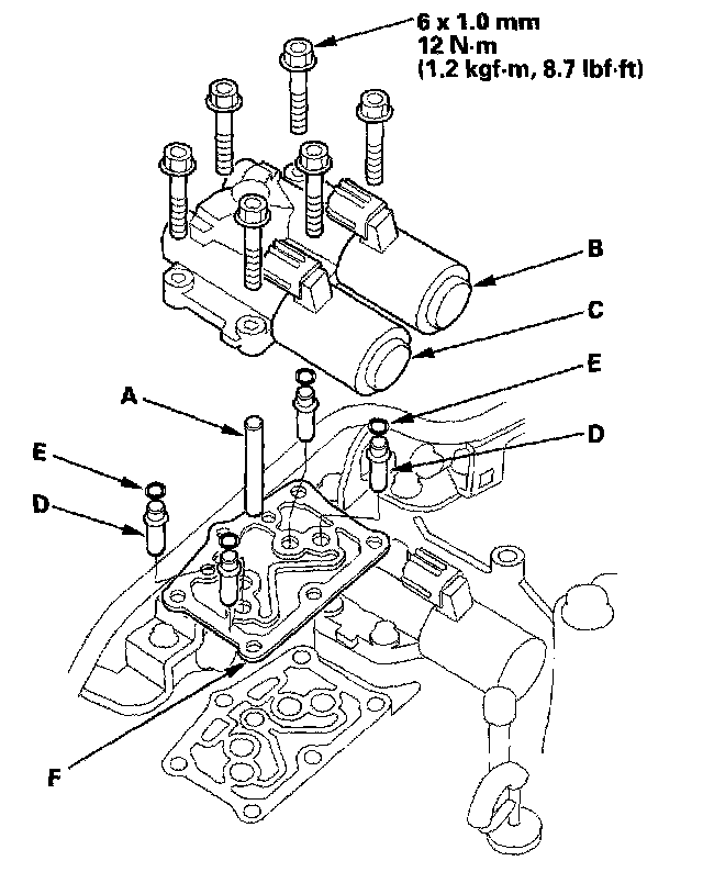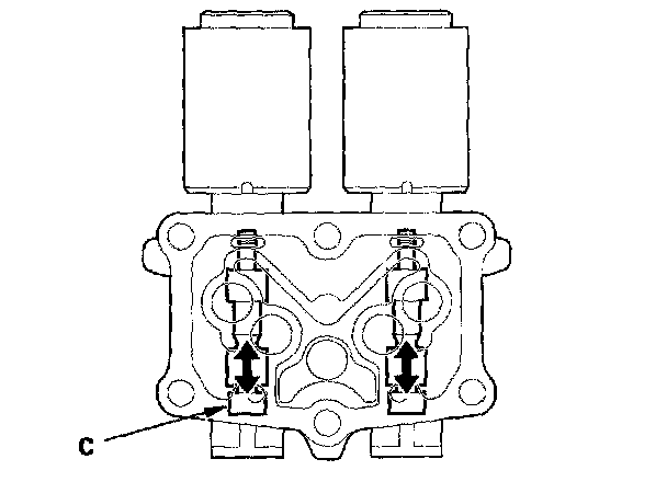 13. Disconnect one of the jumper wires and check valve movement at the fluid passage in the valve body mounting surface. If the valve binds or moves sluggishly, or if the solenoid valve does not operate, replace the A/T clutch pressure control solenoid valve B and C.