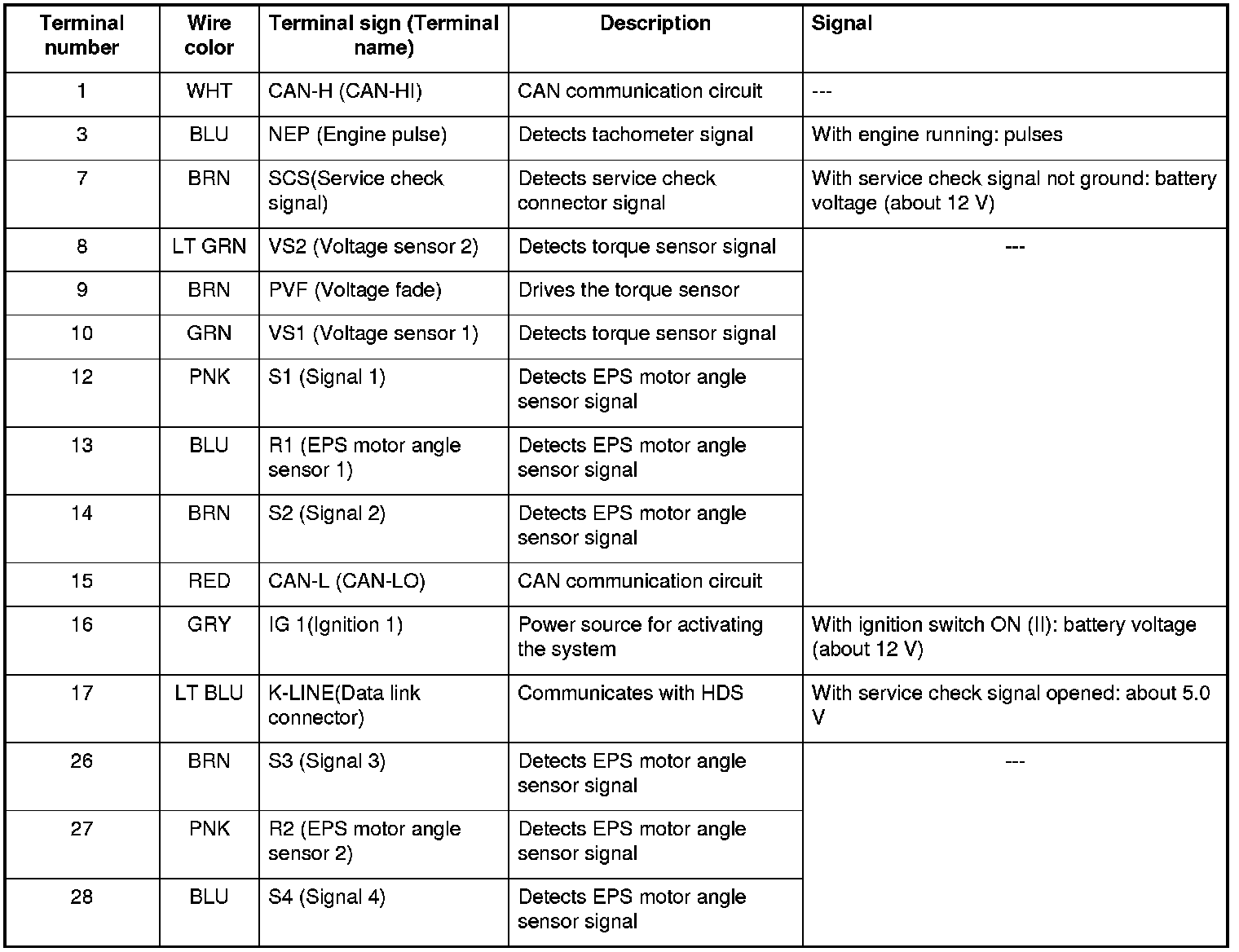 EPS Control Unit Inputs and Outputs for Connector D (28P) (connector disconnected)