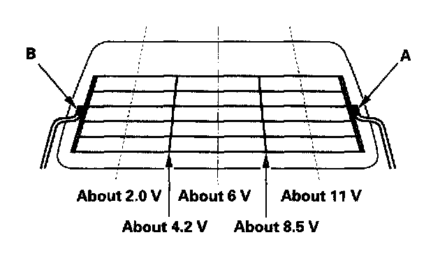 1. Check for voltage between the positive terminal (A) and body ground with the ignition switch and the defogger switch ON. There should be battery voltage.