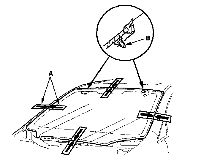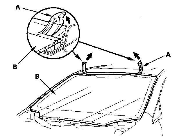 2. Remove the molding (A) from the upper edge of the windshield (B). If necessary, cut the molding with a utility knife.