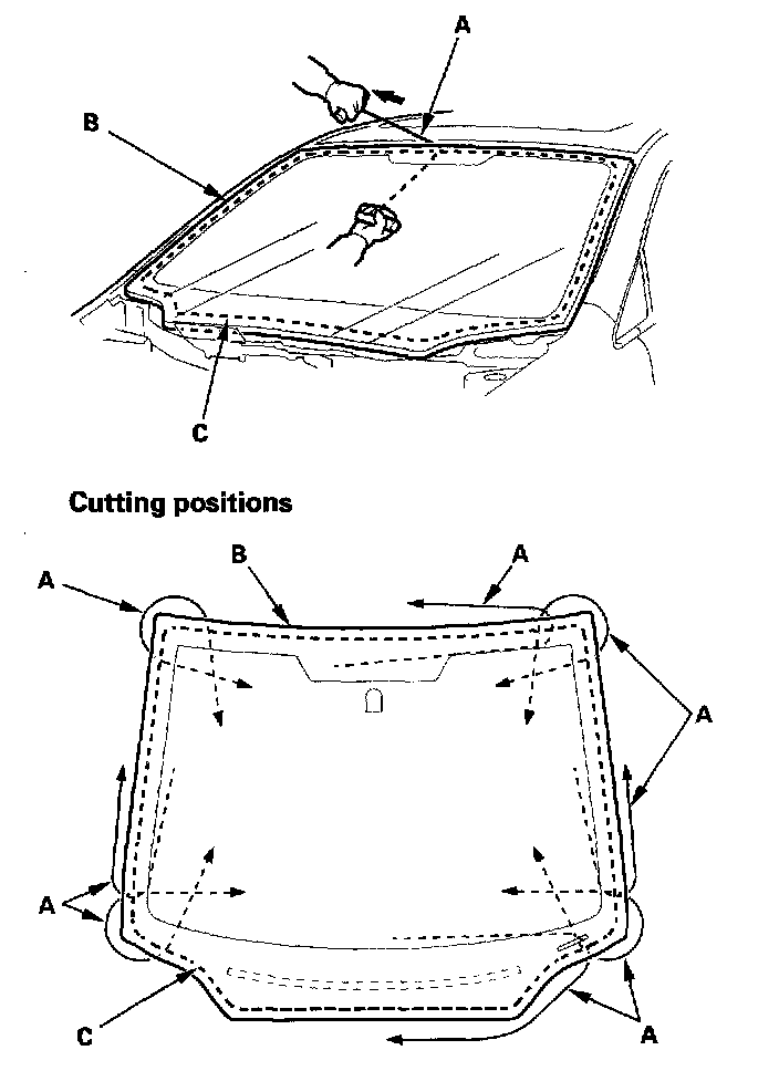 6. With a helper on the outside, pull the piano wire (A) back and forth in a sawing motion. Hold the piano wire as close to the windshield (B) as possible to prevent damage to the body and dashboard. Carefully cut through the rubber dam and adhesive (C) around the entire windshield.