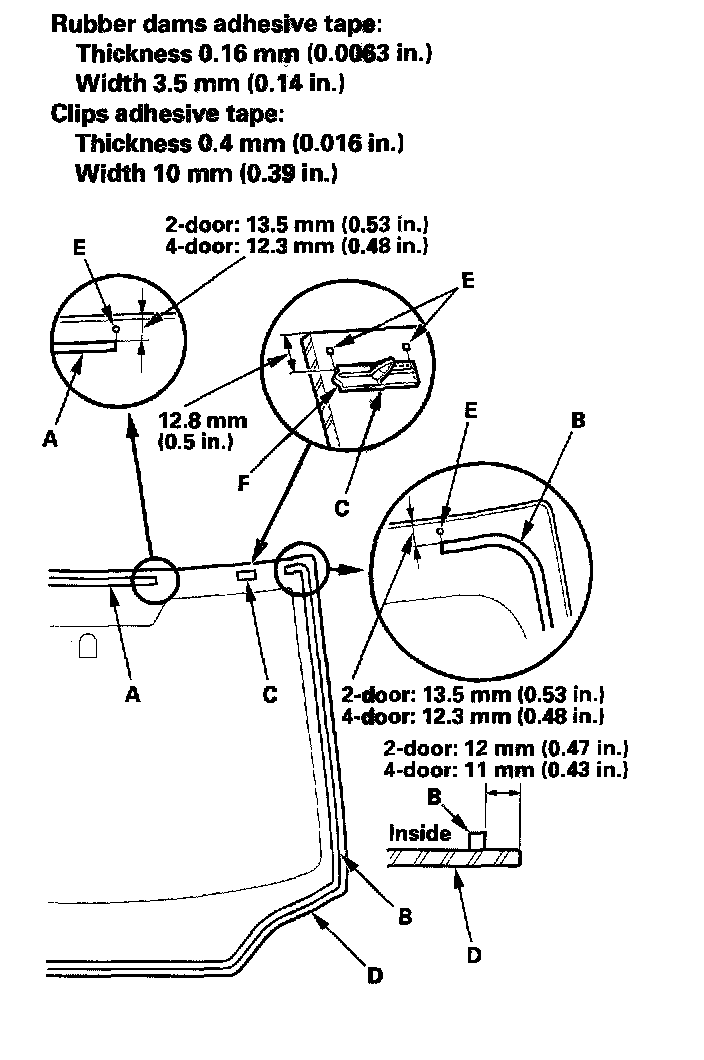 11. Attach the upper rubber dam (A), side rubber dam (B), and clips (C) with adhesive tape to the inside face of the windshield (D) as shown: