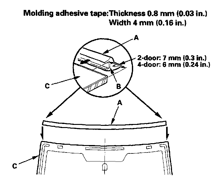 12. Attach the molding (A) with adhesive tape (B) to the upper edge of the windshield (C). Be careful not to touch the windshield where adhesive will be applied.