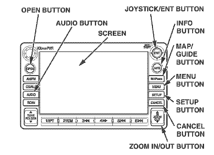 Joystick/ENT - Moves left, right, up, and down. Used to move the highlighting around the display, to scroll through lists, or to look around a displayed map. After making a selection in a menu or list, push in on the joystick to enter the selection into the system. In almost all cases, you can enter a selection into the system by using the voice control system, highlighting the item, and pushing in on the joystick, or by touching the appropriate item on the screen you wish to select.