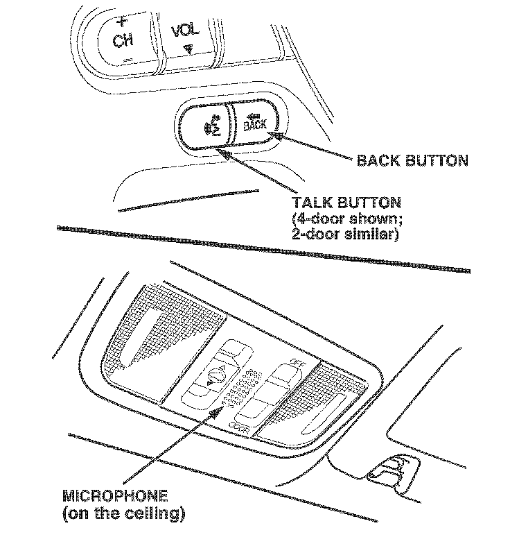 Microphone - Receives voice commands. The navigation system communicates through the audio speakers. The navigation system gives guidance instructions through the front speakers. When you are using the voice control system to give commands (by pressing the TALK or BACK buttons), the front and rear speakers are muted. You can view or hear the voice command list by pressing the INFO button and selecting Voice Command Help. A tutorial is included that explains the operation of the voice control system. Refer to the quick start guide and the navigation system manual for detailed information.