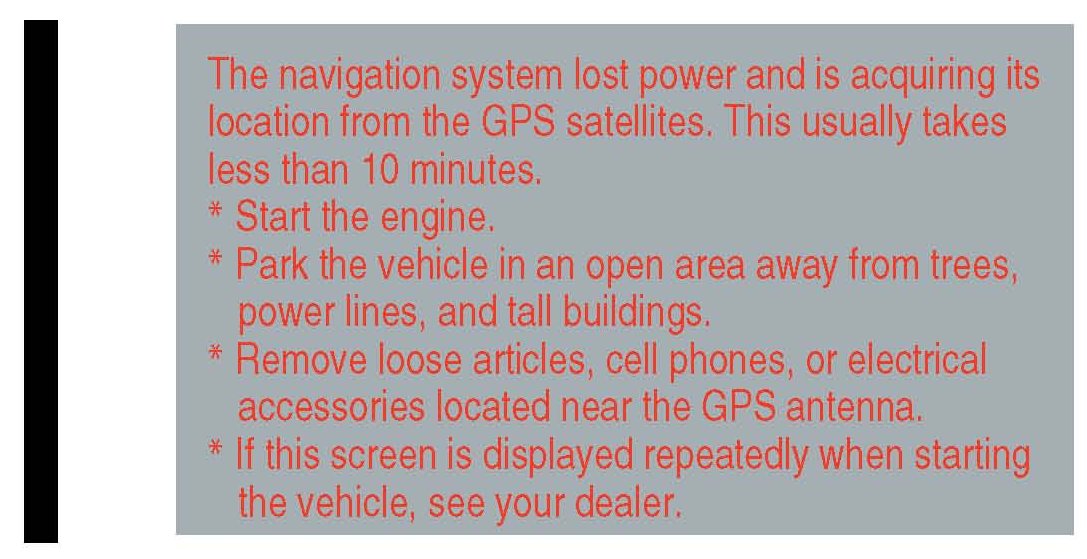 5. If the system does not initialize within 10 minutes, the screen shown below appears. The system is still initializing but will not automatically exit to the screen above when initialization is complete. Do not immediately follow the instructions on the screen. After 30 minutes, try restarting the vehicle to see if the navigation system completed the initialization. If not, follow the instructions on the screen.