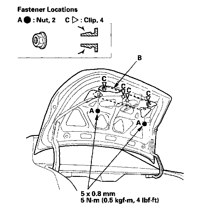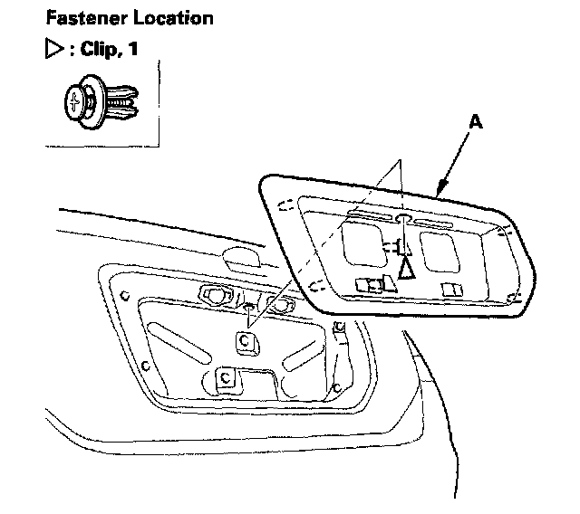 1. From inside the trunk lid, remove the nuts (A) securing the rear license trim (B), and push out the clips (C).