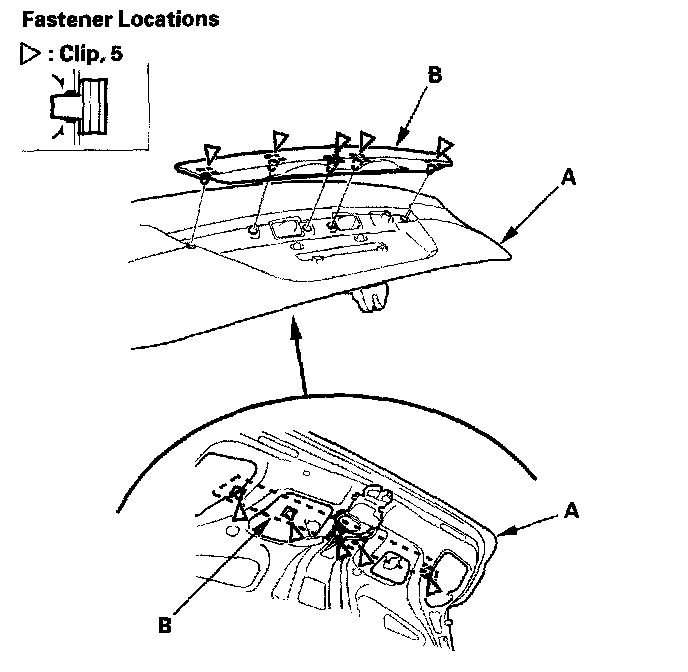 3. Detach the clips by pushing it from the hole in the trunk lid (A), then remove the rear license trim (B). Take care not to scratch the trunk lid.