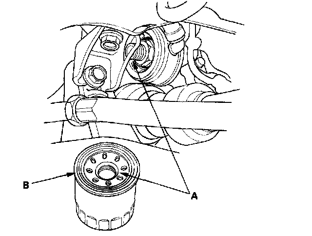 3. Inspect the threads (A) and rubber seal (B) on the new filter. Clean the seat on the oil cooler, then apply a light coat of new engine oil to the filter rubber seal. Use only filters with a built-in bypass system.