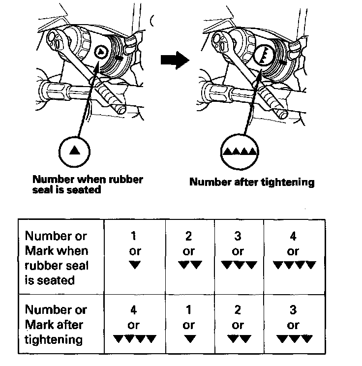 ^ Spin the filter on until its seal lightly seats against the oil cooler, and note which number or mark is at the bottom.