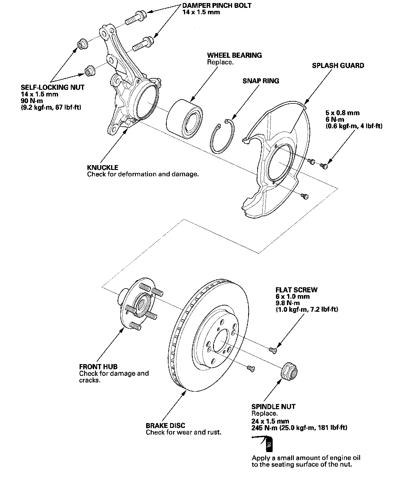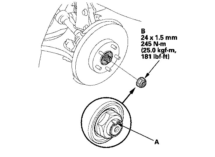 ^ Before installing the spindle nut, apply a small amount of engine oil to the seating surface of the nut. After tightening, use a drift to stake the spindle nut shoulder against the driveshaft.