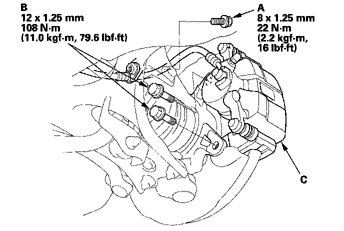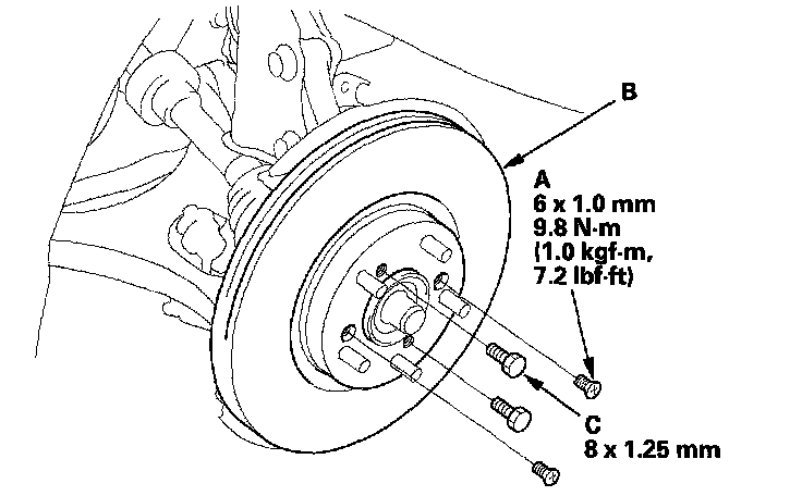 NOTE: If the brake disc is stuck an the hub. Screw two 8 x 1.25 mm bolts (C) into the brake disc to push it away from the hub. Turn each bolt 90 degrees at a time to prevent the brake disc from binding.