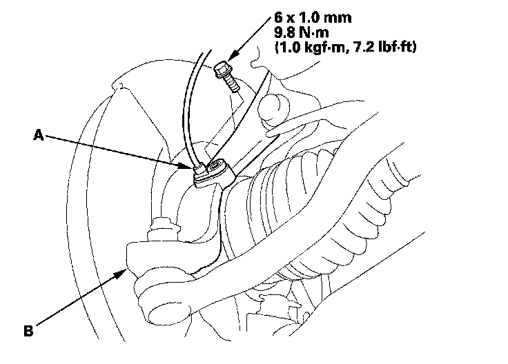 5. Remove the wheel sensor (A) from the knuckle (B). Do not disconnect the wheel sensor connector.