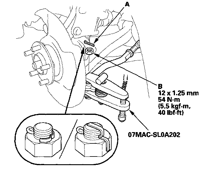 ^ Torque the castle nut to the lower torque specification, then tighten it only far enough to align the slot with the ball joint pin hole. Do not align the castle nut by loosening it.