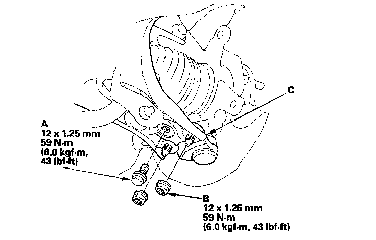 12. Remove the flange bolt (A) and flange nuts (B) from the lower arm (C).