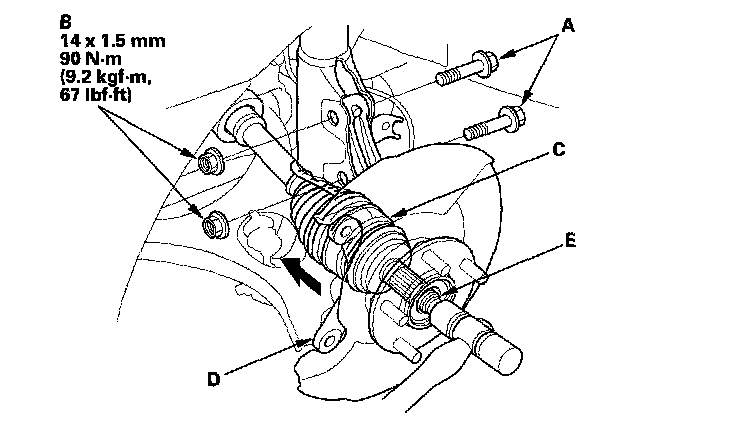 15. Remove the driveshaft outboard joint (C) from the knuckle (D) by tapping the driveshaft end (E) with a plastic hammer while drawing the hub outward, then remove the knuckle.